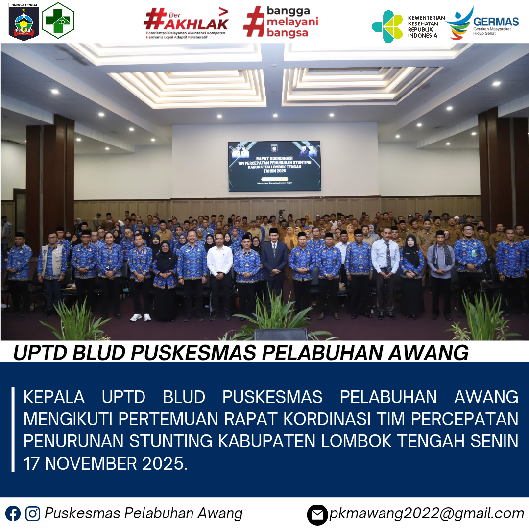 Kepala UPTD BLUD Puskesmas Pelabuhan Awang Lalu Hartono A, S.Gz, M.Kes menghadiri Pertemuan Rapat Koordinasi Tim Percepatan Penurunan Stunting Kabupaten Lombok Tengah yang digelar pada Senin, 17 November 2025, bertempat di Ballroom Kantor Bupati Lombok Tengah.